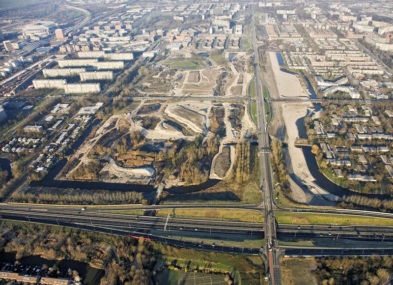 Bijlmerpark 1, 55 hectare, op- en afrit, dempen waterpartijen